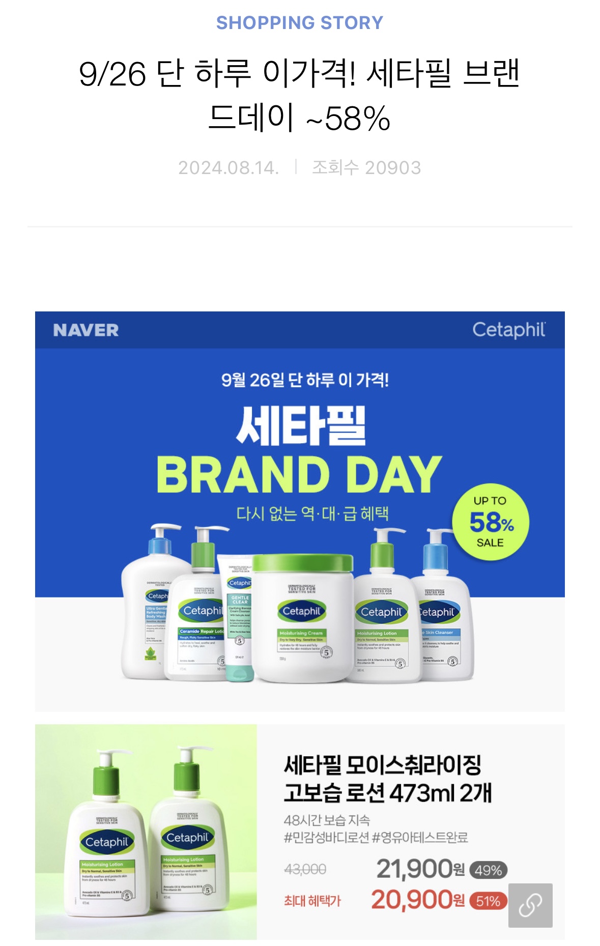 네이버-세타필 브랜드 데이 (9/26 단 하루) 최대 58%할인 세타필 브랜드 데이 세일이 오늘 단 하루래요 가을, 겨울, 봄까지 건조한 계절이니 세일할 때 보습제 챙겨두시면 든든할거에요 ❣️오후 6시 라이브 이벤트도 있다니 시간되시면 참여해보세요 https://m.brand.naver.com/cetaphilshop/shoppingstory/detail?id=5001431821 세타필 공식스토어 : 브랜드스토어스위스 민감피부 전문 더마 브랜드brand.naver.com 핫딜 2024.09.26