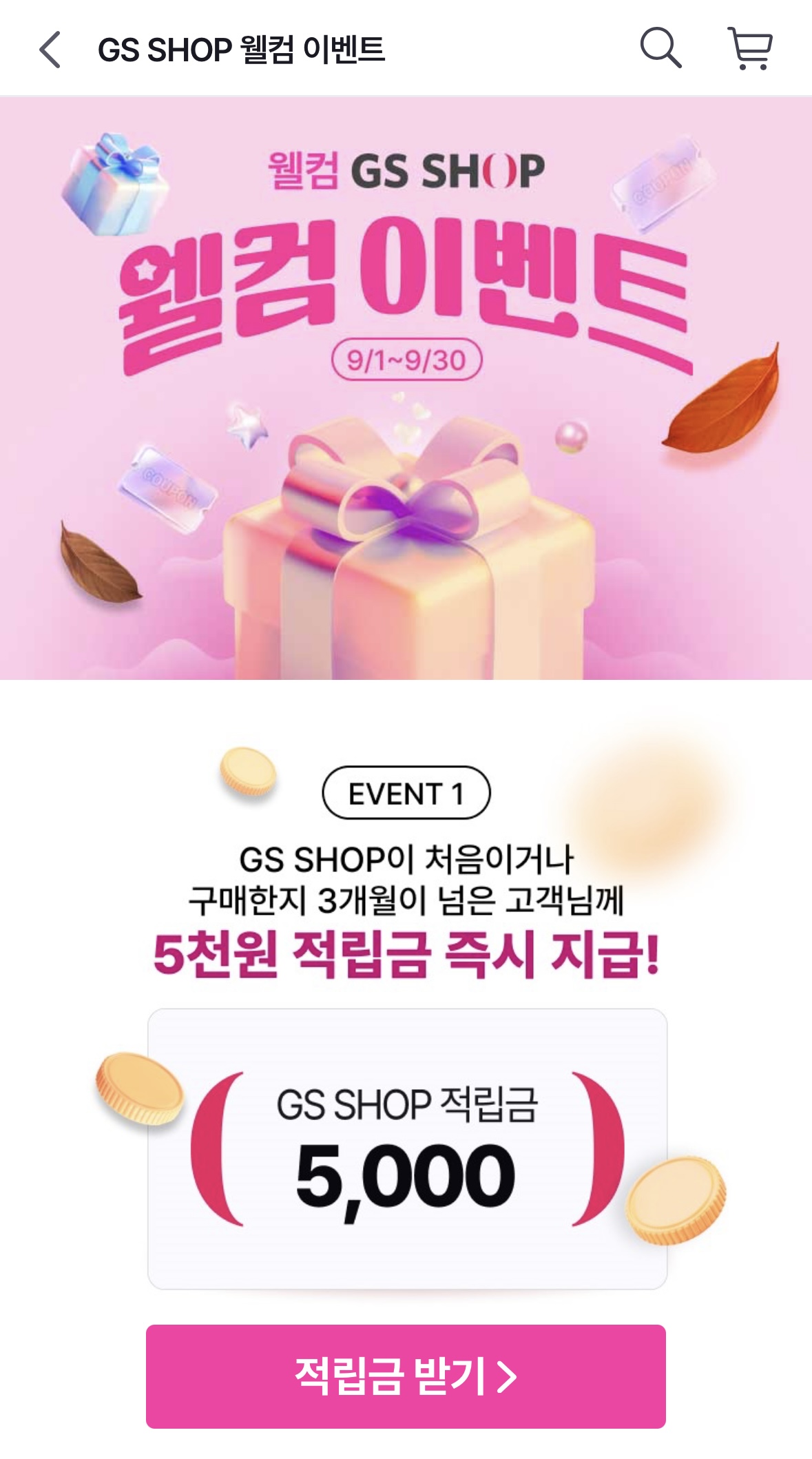 GS샵 9월 한달 웰컴이벤트 5천원 즉시적립 (신규 혹은 구매시기 3개월지난 고객대상)